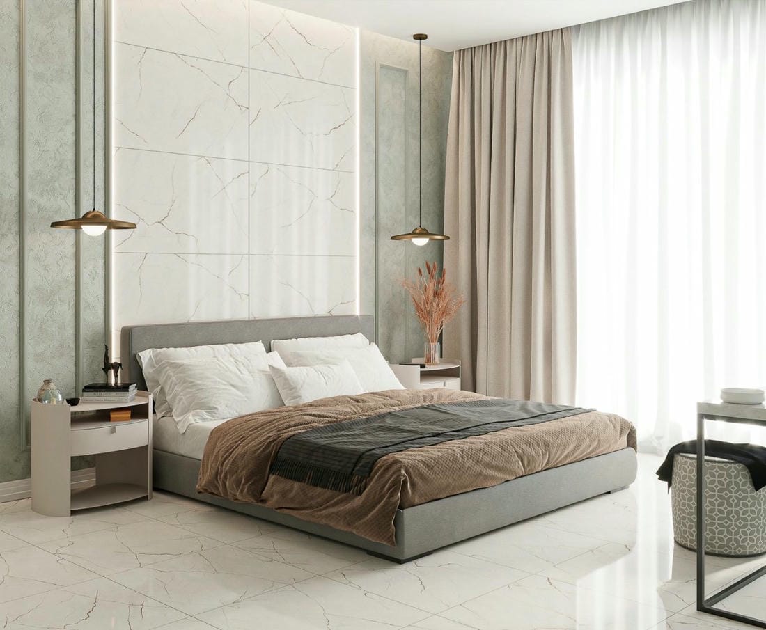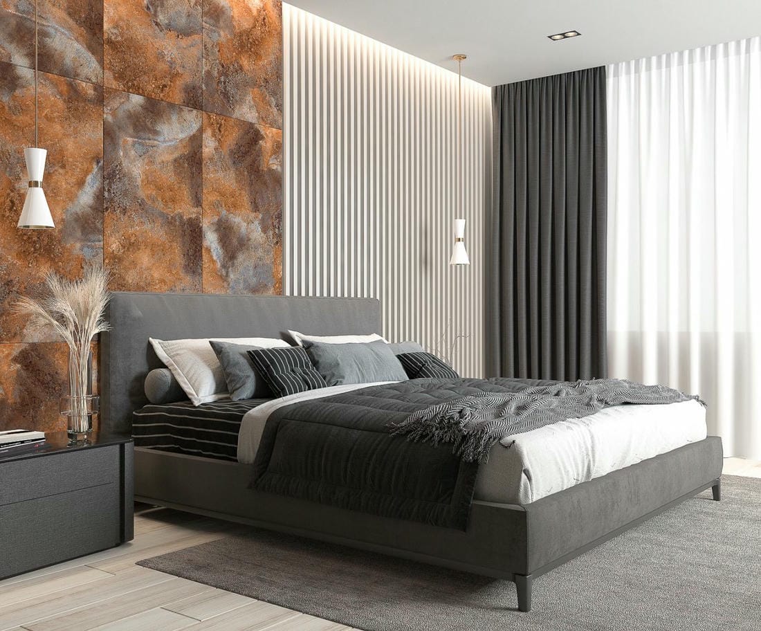 Благодаря богатой натуральной фактуре керамогранита границы его применения постоянно расширяются. Становится актуально его использование в спальне наряду с привычными нам обоями. Не обязательно облицовывать всю стену, можно выделить ее часть или сделать панно. Если дизайн спальни сделан в нейтральной цветовой гамме, то для акцента можно использовать любой понравившийся цвет и фактуру, не переживая, что он не подойдет.