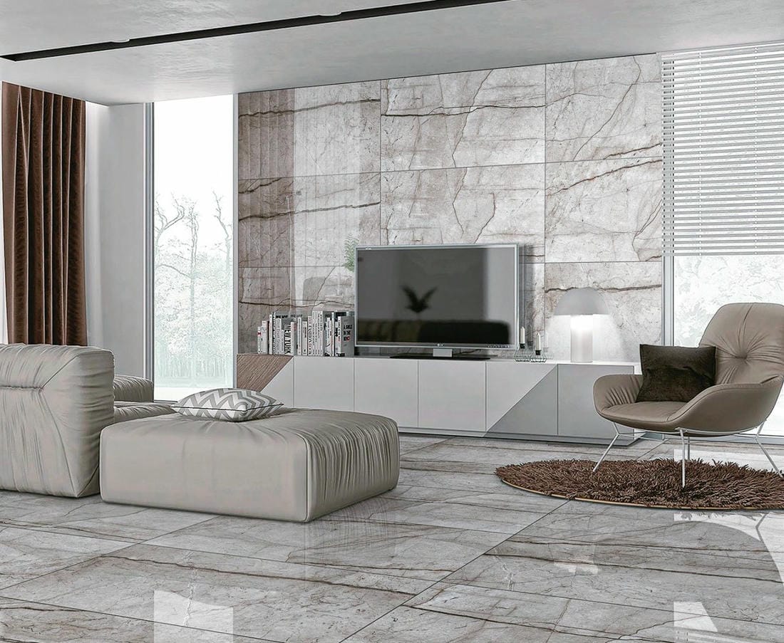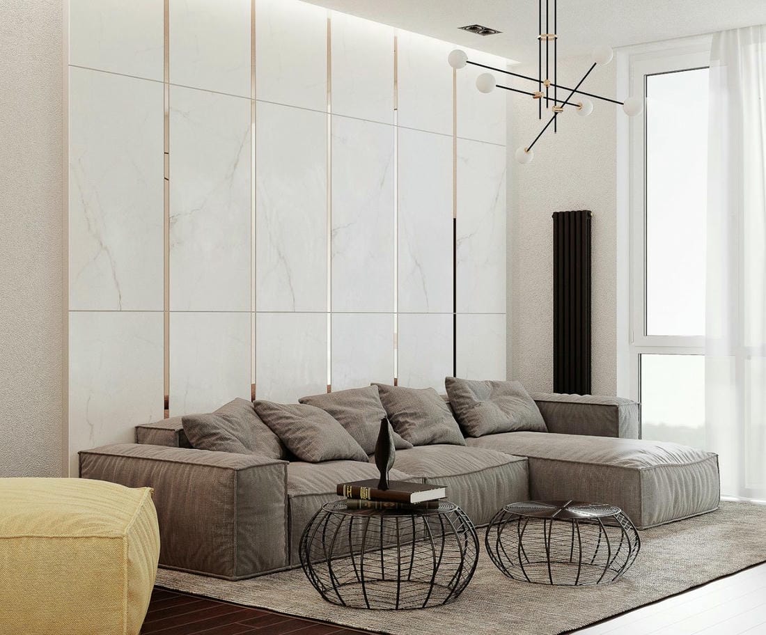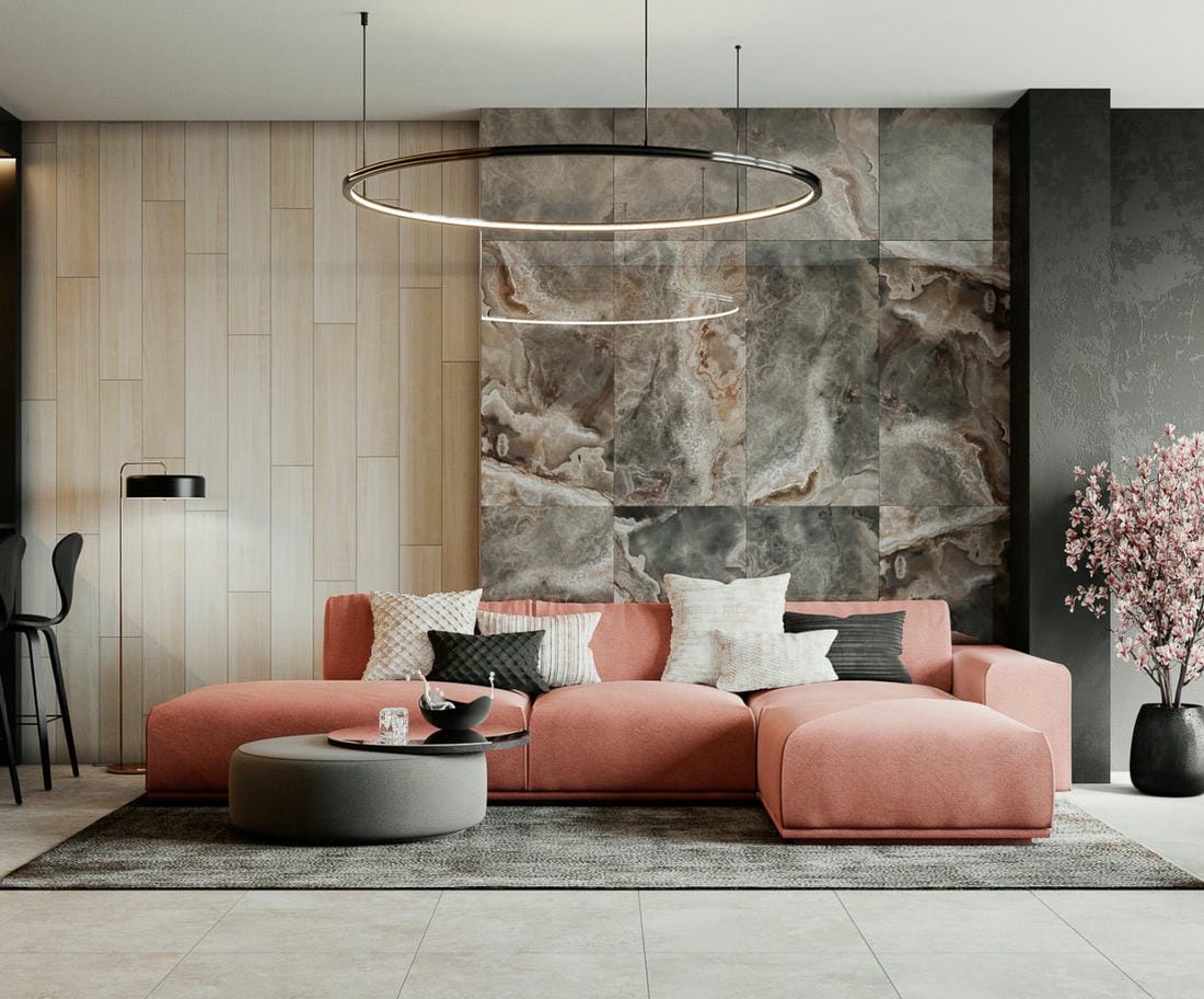 Для создания акцентных стен используются различные материалы. Постоянные пробы и эксперименты в дизайне создают новые тренды. И сегодня на пике популярности таким материалом стал керамический гранит. Еще недавно в наших регионах плитка в гостиной считалась не совсем традиционным способом отделки стен и пола, а сейчас она все больше набирает свою популярность.