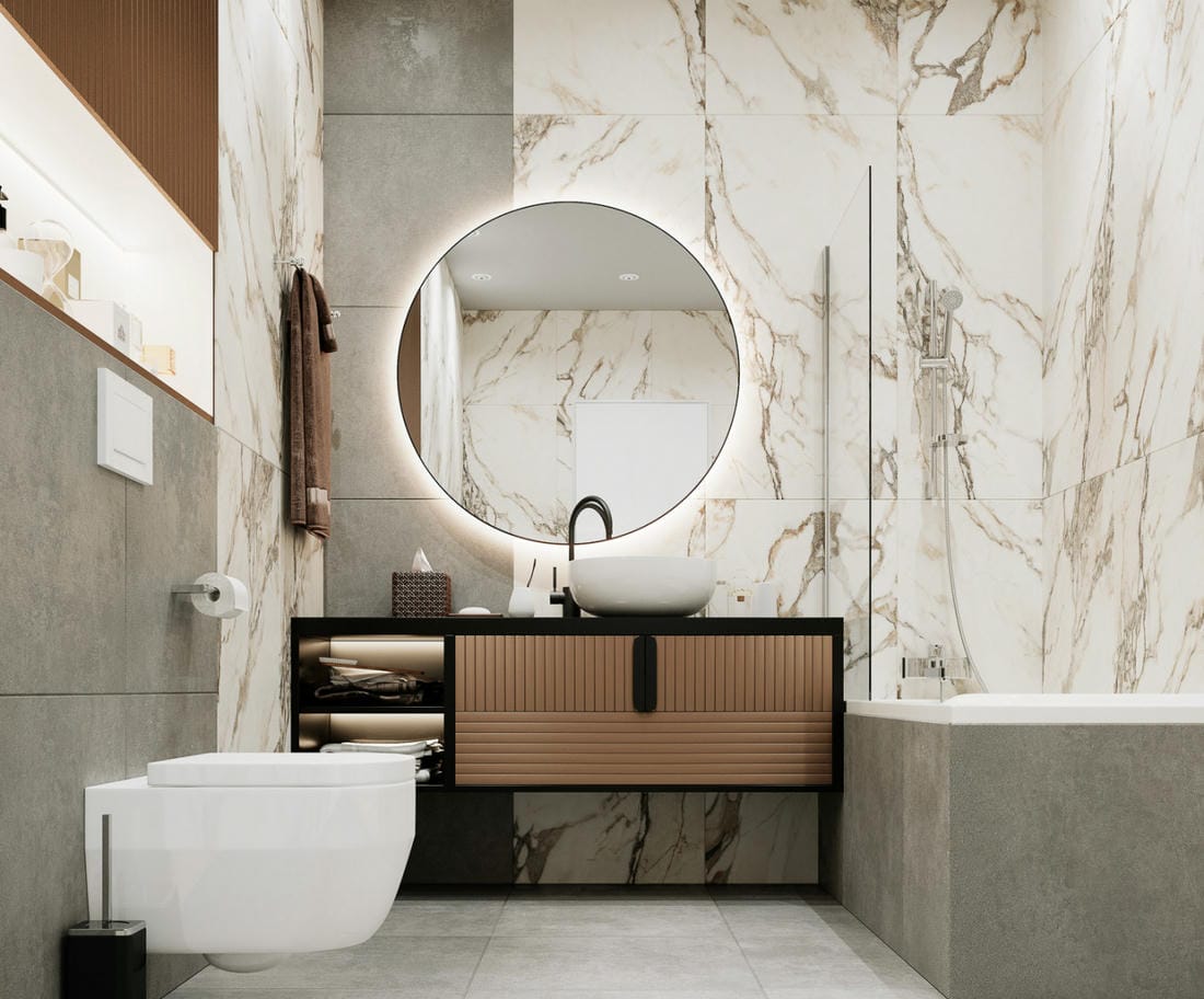 Бетон и мрамор обеспечивают друг другу выгодное соседство. Грубость и холодность бетона сгладят светлые матовые оттенки мрамора, а полированные поверхности подчеркнут неровную матовую фактуру бетона. Соединение таких текстур в интерьере создают одновременно изящную и современную обстановку.