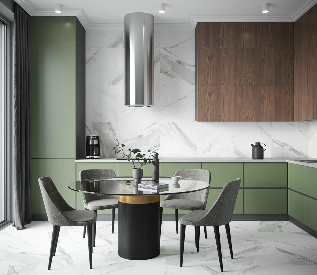Белый мрамор на кухне.