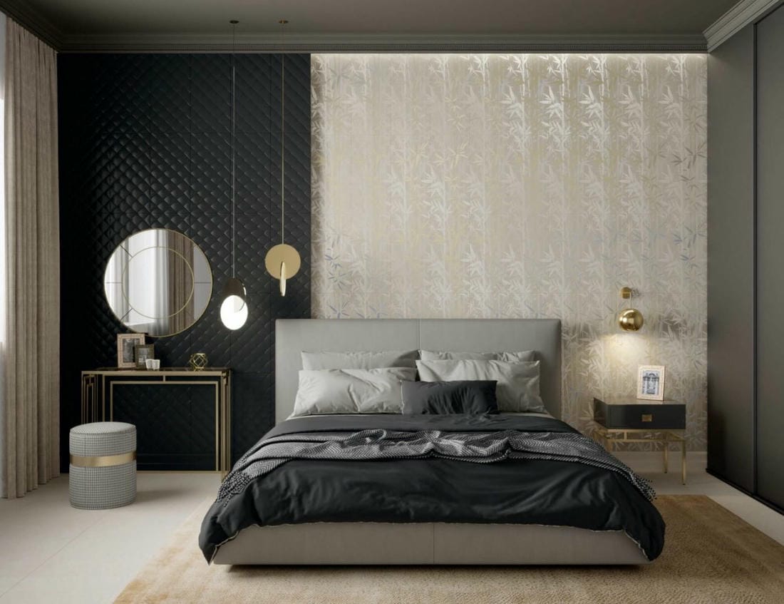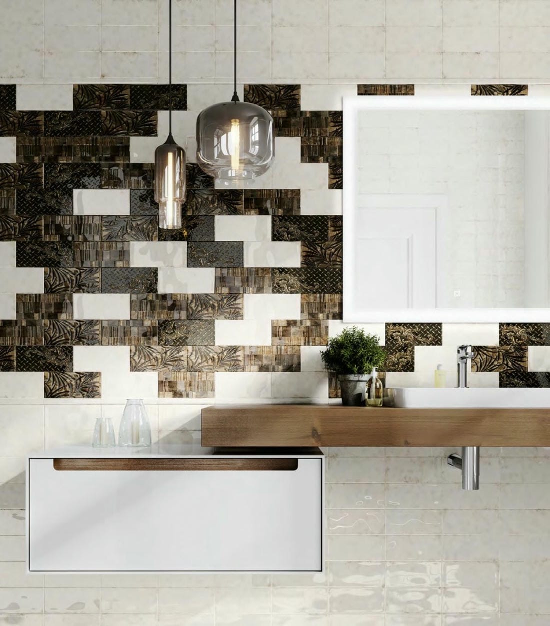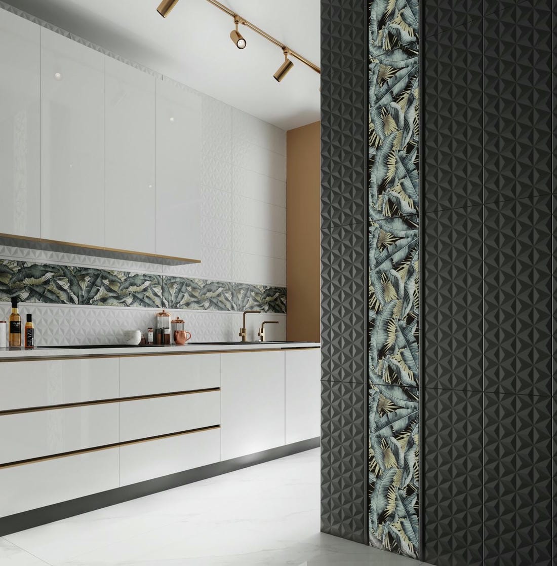 Крупноформатная плитка с геометрической структурой, напоминающей оригами, сочетается с насыщенным природным мотивом