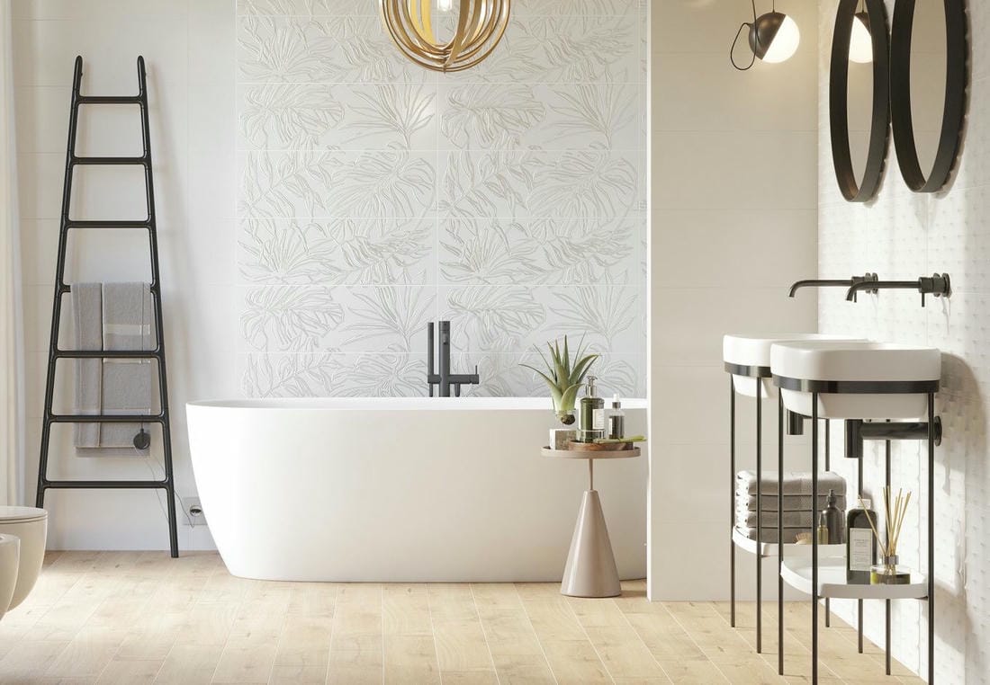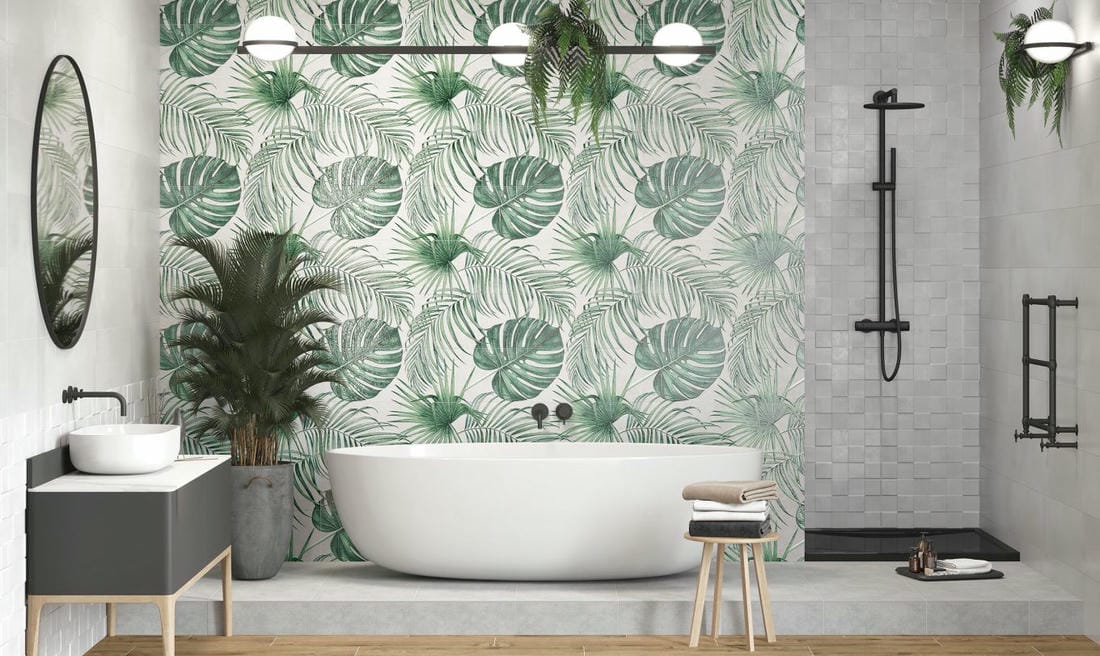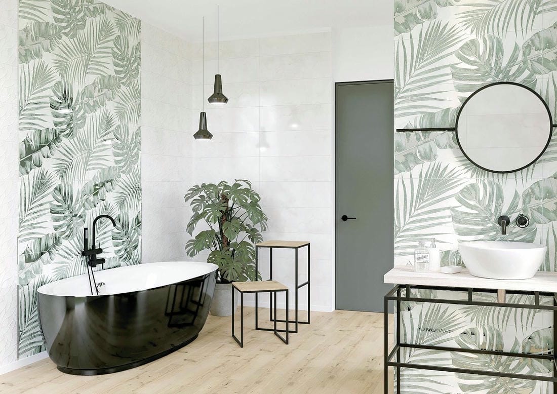 Можно сказать, что тропический принт сегодня стал одним из хедлайнеров интерьерного дизайна . Растительные декоры и панно сочетаются с большинством текстур: дерева, камня, бетона и мрамора. Светлые оттенки фоновой плитки уравновешивают крупный орнамент с листьями и визуально увеличивают площадь. А темные тона базовой плитки оказывают расслабляющее воздействие и особенно хорошо смотрится в просторных помещениях с нестандартной планировкой.Активный растительный узор обладает невероятной силой и неизбежно притягивает взгляд, а значит играет в интерьере главную декоративную роль. Он отлично сочетается с мебелью на деревянных и металлических каркасах, которая открывает максимально много свободного пространства.