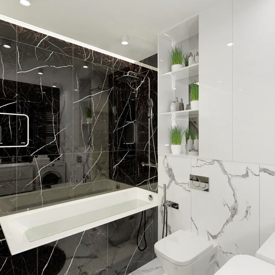 Даже в небольших ваннах можно экспериментировать с контрастными цветами. Главные правильна: верно подобрать цвета, текстуры и освещение. Если сделать акценты на одной или двух зонах, то получится современный и стильный дизайн. Не стоит боятся большого формата, он создаст наибольшую чистоту и гармонию.