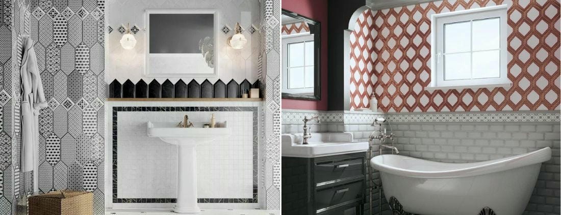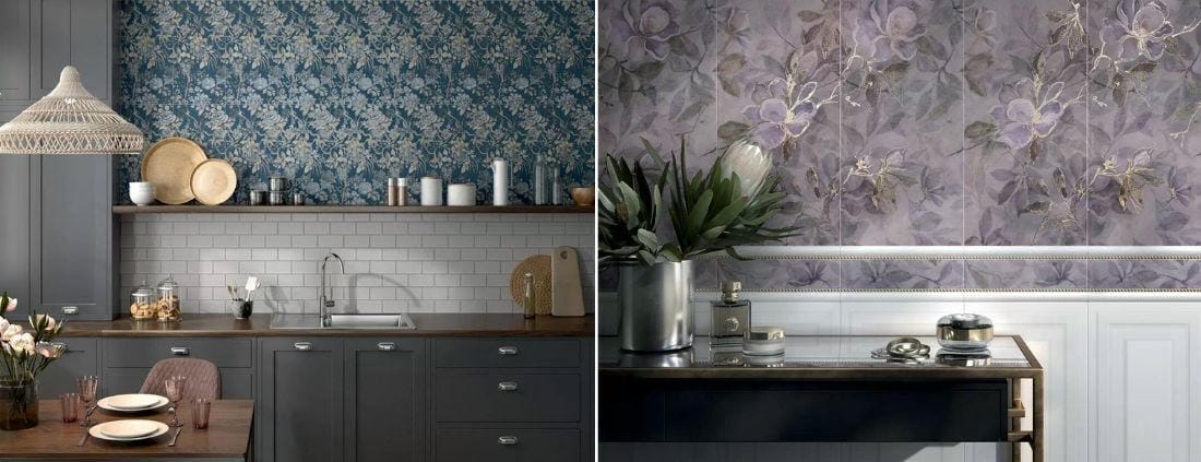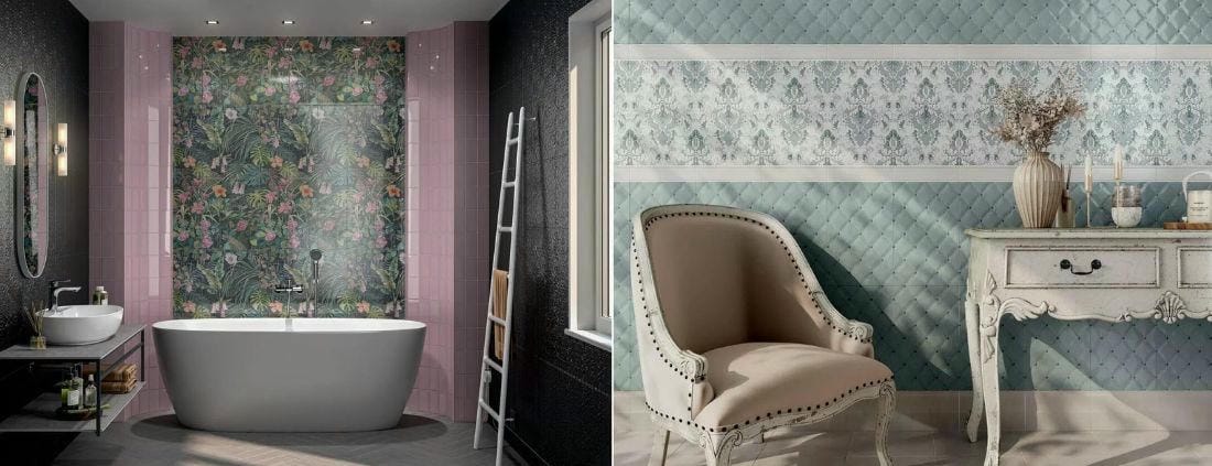 Целый ряд серий предлагает хороший выбор декоров одного формата и стиля, но с разной графикой. При создании керамической композиции мы вправе использовать какую-то часть этих декоров, а можем применить весь выразительный потенциал серии - в этом случае на стене будет много разных декоров, работающих на усиление одной эстетической идеи. Так дизайнеры часто поступают с декоративными элементами «Келуш» и «Клемансо»: в обеих сериях предложено множество эффектных решений, и в соединении они всякий раз дают новое, ни на что не похожее пространство.