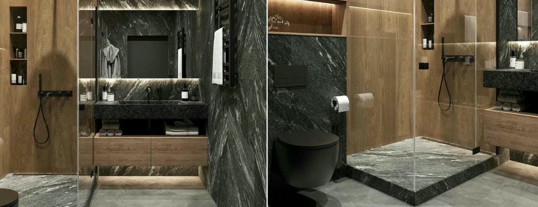 Еще одна вариация на природную тему, только в этот раз выдержанная преимущественно в глубоких темных тонах. Главный акцент в этом интерьере – альпийский камень, который смотрится очень динамично благодаря необычной графике и прожилкам белого цвета. Чтобы смягчить и сбалансировать его выразительную текстуру, в зоне душевой был использован керамогранит под дерево.