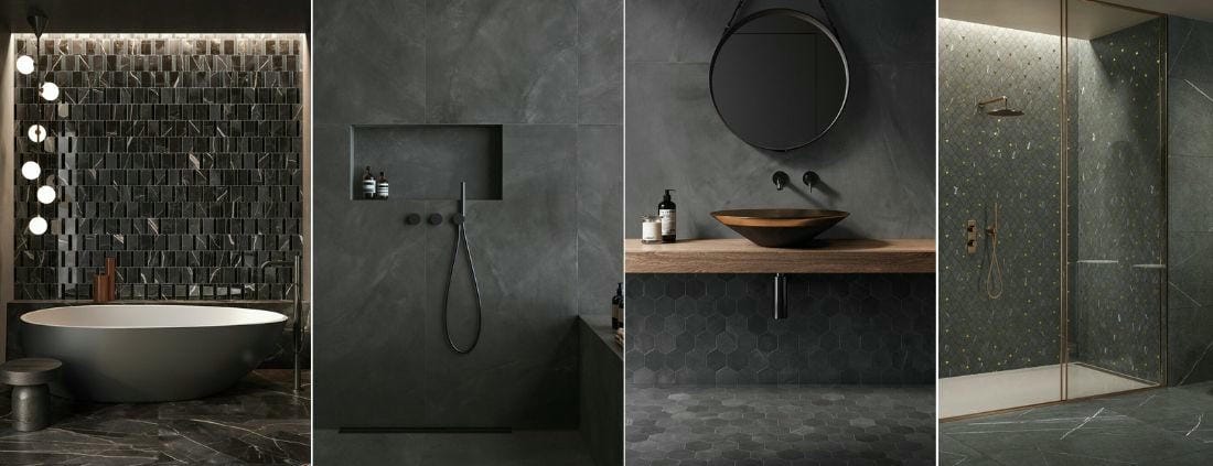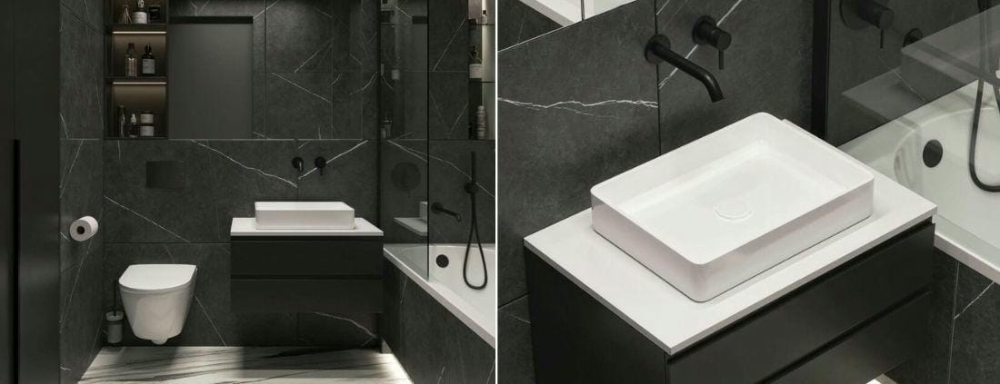 4. Практичность. На темном покрытии практически не видны повседневные загрязнения, поэтому его проще поддерживать в опрятном состоянии. А мыльный и известковый налет, который появляется при использовании душа, легко убирается подходящей бытовой химией.
