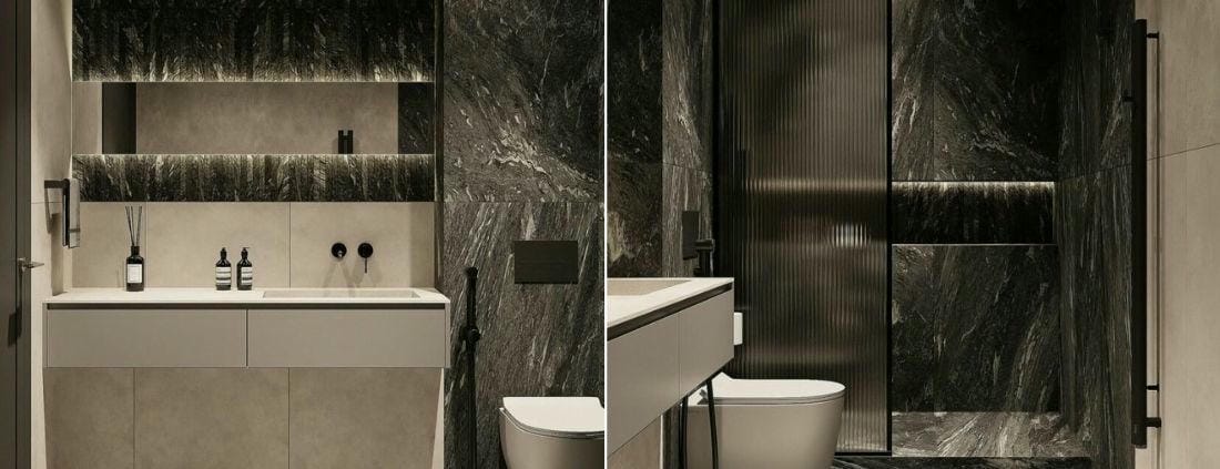 Здесь с помощью альпийского камня оформлена душевая кабина и часть пространства перед ней. Этот же материал в формате реек татами украшает собой стену за умывальником, создавая оригинальный ритмичный паттерн. Светлые разводы на черном фоне выглядят экспрессивно и ярко, а белый цвет прожилок стилистически перекликается с основной отделкой ванной.
