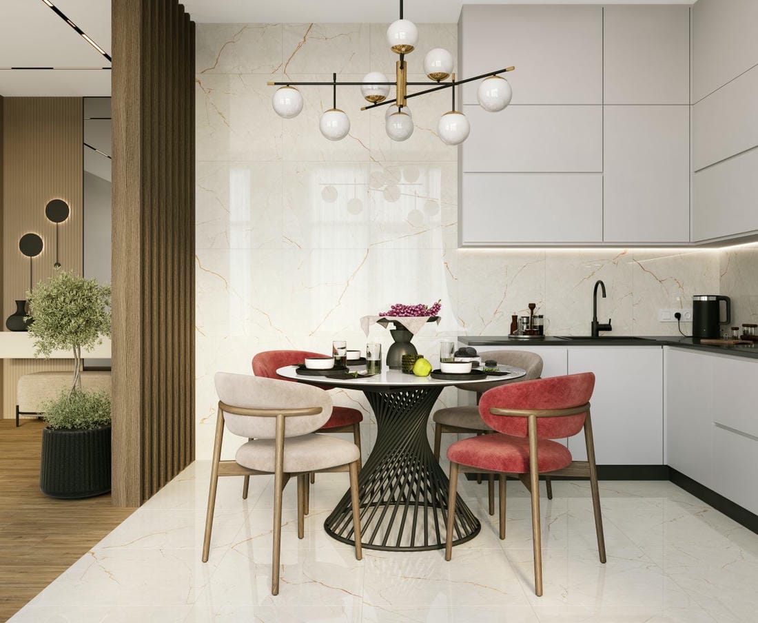 Фартук уже, чем столешница. Визуально наполнение комнаты выглядит органично, если фартук уже, чем столешница. Когда поверхности выполняются из одинакового материала, например, из искусственного камня одного цвета, важно уменьшить ширину фартука до 25-30 см. А в мокрых зонах фигурно повысить ее.