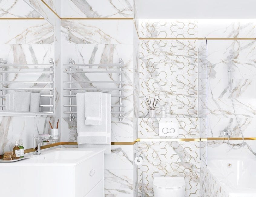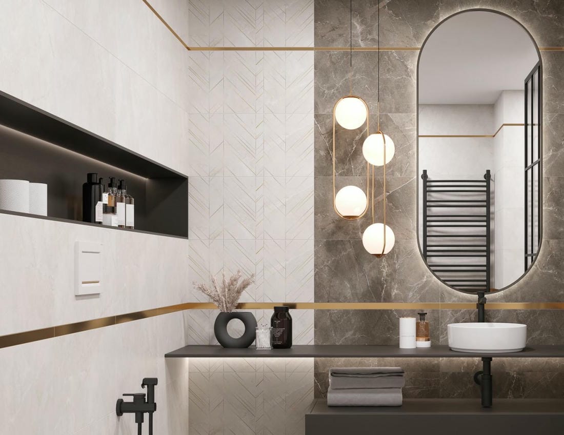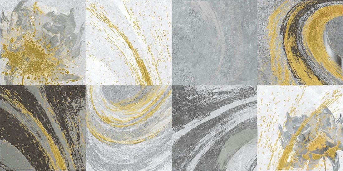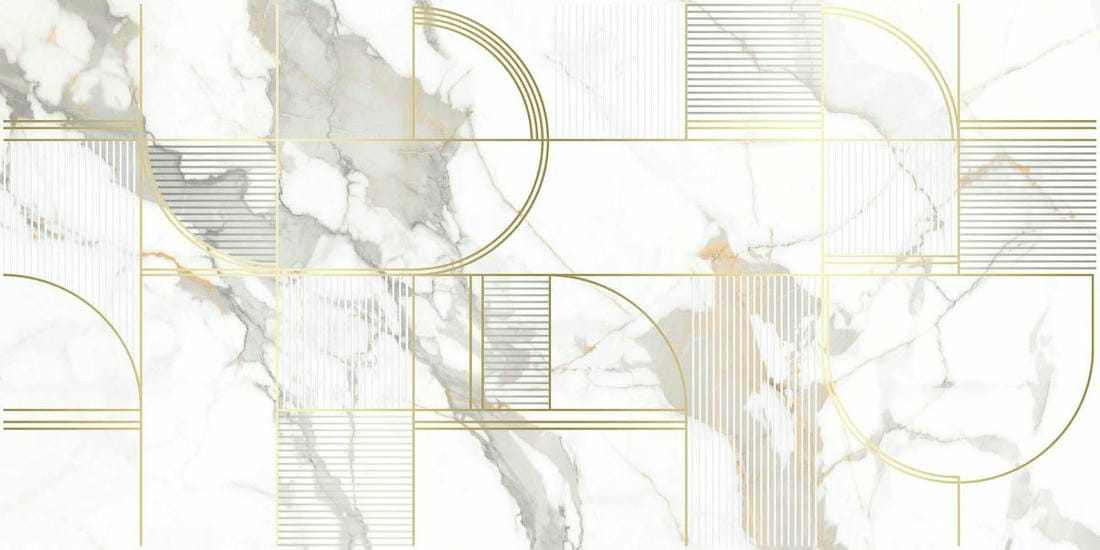 Тонкая линейная геометрия Laparet. Металлизированные линии и тонкая геометрия на плитке - это очень эффектный вариант отделки. Линии отлично сочетается с глянцевой и матовой поверхностями, не закрывая базовый принт плитки, а лишь украшая и подчеркивая его. Разнонаправленные изящные линии придают помещению стильный и утонченный облик.