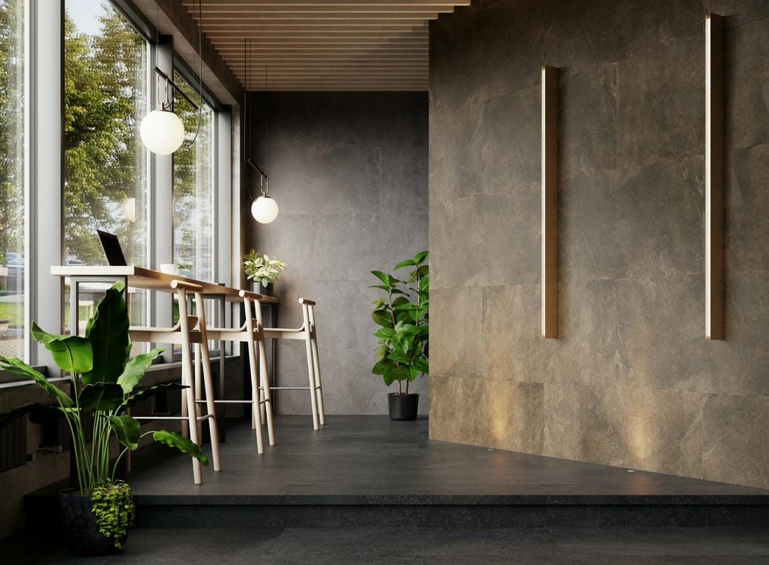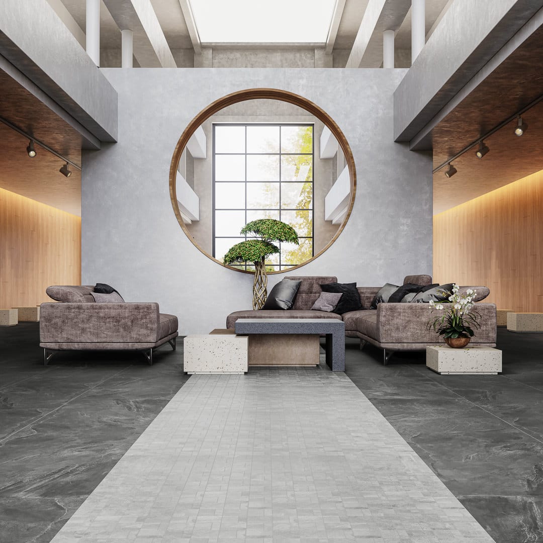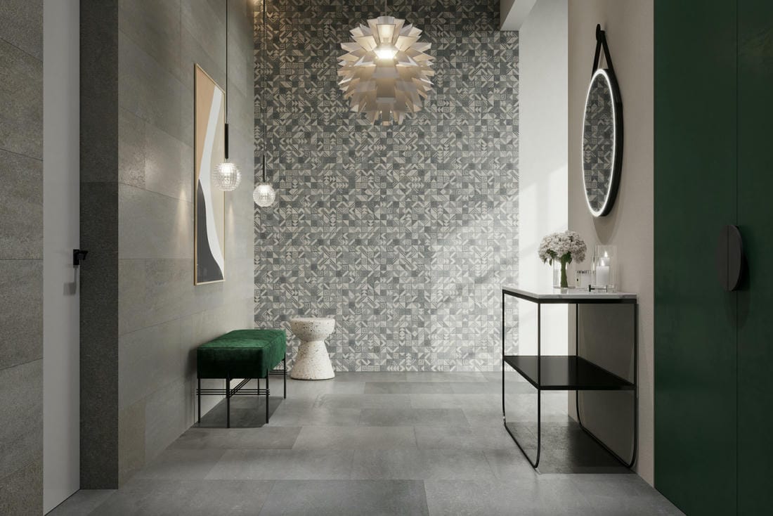 В таких случаях требуется технический керамогранит, который выдержит большую нагрузку и будет иметь высокую устойчивость к истиранию. На рынке плитки такие варианты существуют, но они довольно просты в своем исполнении и редко имеют интересный дизайн. А ведь используемый материал в отделке пространства играет огромную роль и подчеркивает общую среду.