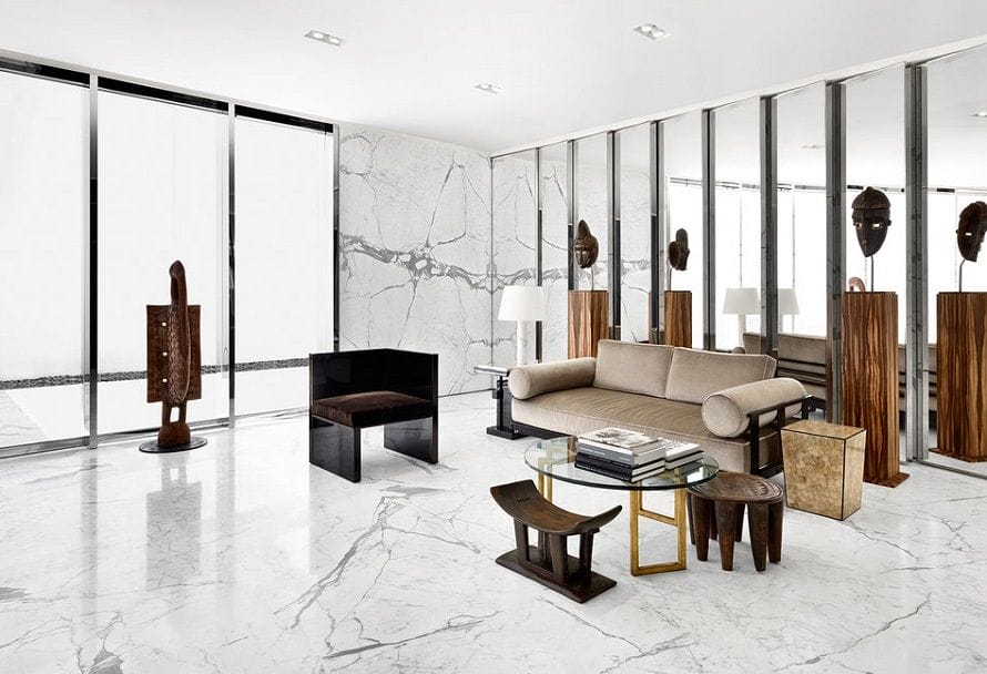 Знаменитый дизайнер Эди Слиман создал интерьер парижского бутика Saint Laurent в знаковом историческом здании на улице города. Магазин представляет собой ультрасовременное пространство, сочетающие этническими мотивы с акцентом на мрамор Statuario.