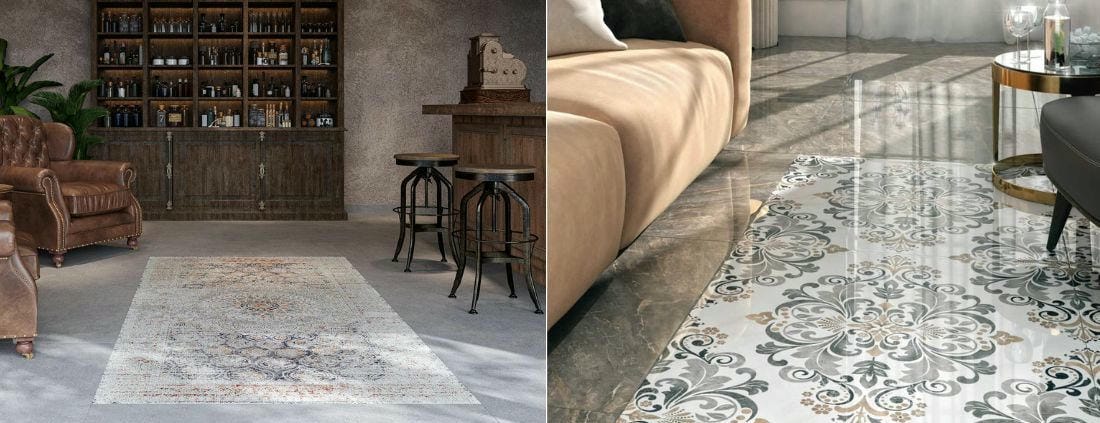 Некоторые из керамических ковров действительно похожи на тканый ковёр своим рисунком. Но этим вариации дизайна МАКСИ-ковров далеко не ограничиваются. Живопись, геометрические орнаменты, воспроизведение эффектов мозаики и инкрустации – всё это делает такие декоры универсальным инструментом в руках интерьерного дизайнера.
