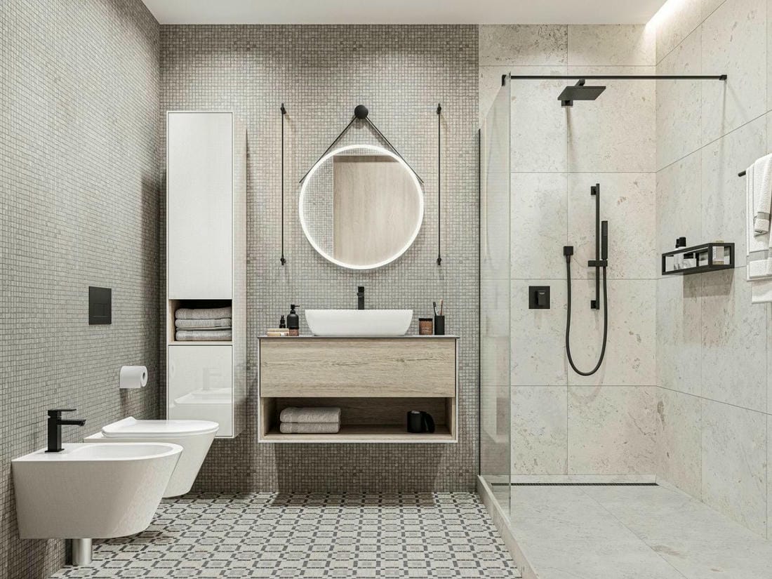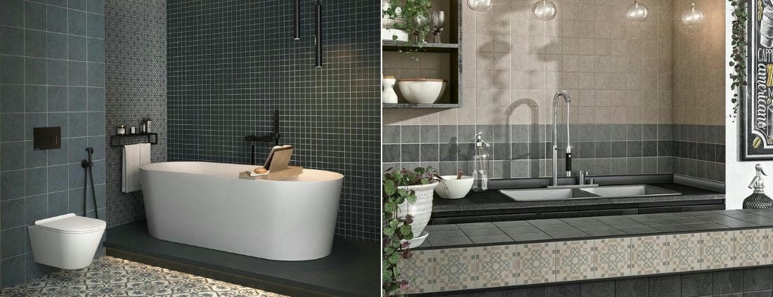При укладке плитки и/или керамического гранита во избежание подрезки можно использовать мозаику в виде бордюров любой ширины.
