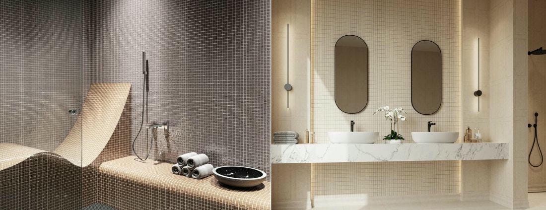 Для производства мозаики используются тугоплавкие белые глины, благодаря этому она обладает высокой механической прочностью и водопоглощением, близким к нулю. Небольшие размеры мозаичных чипов позволяют гасить возникающие напряжения и давление воды, а гладкая блестящая поверхность облегчает очистку стенок от микроорганизмов. Плитка мозаика — идеальный вариант для ванной, бассейна, хаммама, душевого поддона.