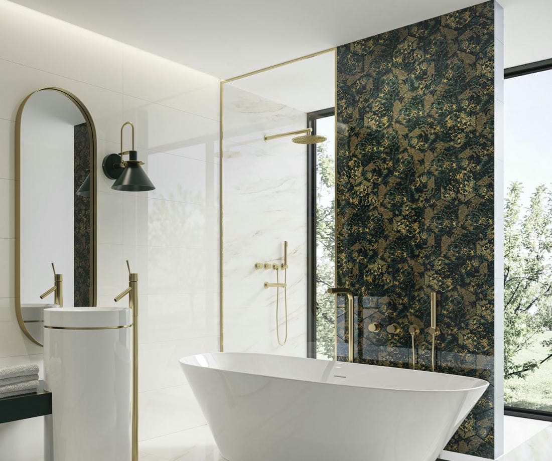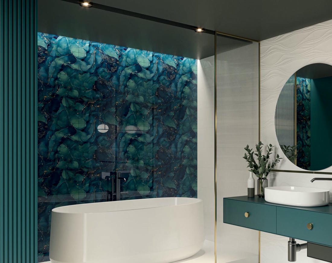 Стеклянной плиткой облицовывают стены, потолки и даже пол. Благодаря своим характеристикам она хорошо проявляет себя в помещениях с повышенной влажностью, поэтому она - частый гость в ванных комнатах. Стеклянными декорами выделяют акцентные зоны на кухне, гостиных и даже спальнях.