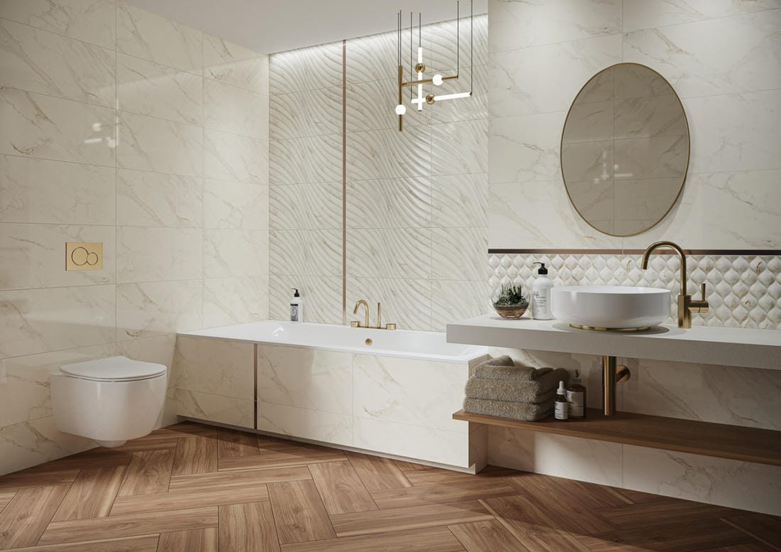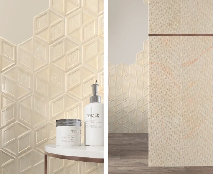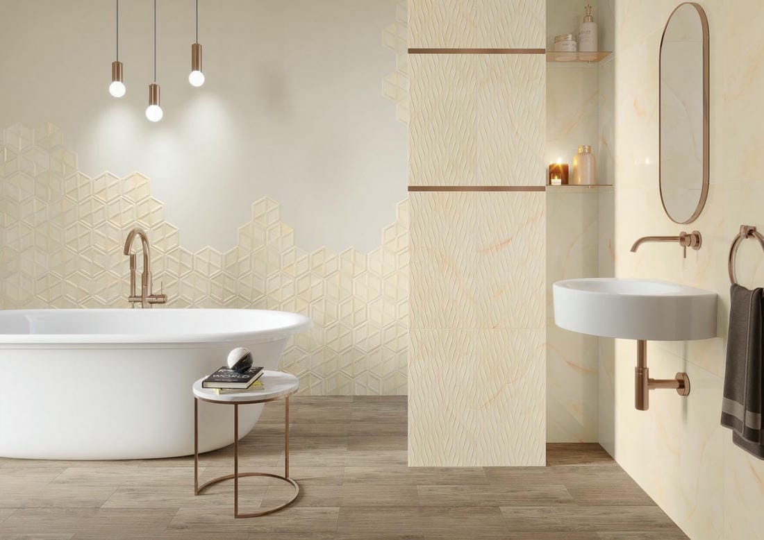 Позаботьтесь о себе и своем интерьере, давая окружить себя мягкой структурой оникса. Сделайте ставку на нежные теплые оттенки плитки, которая дополнит декор в оттенках