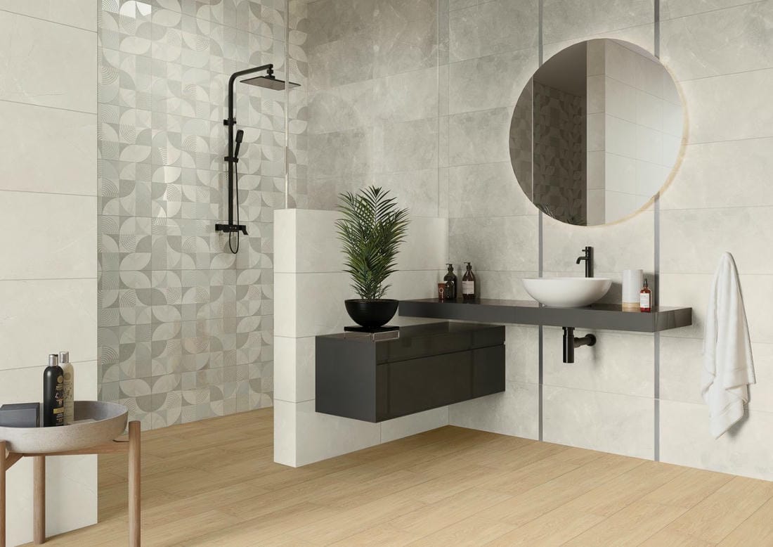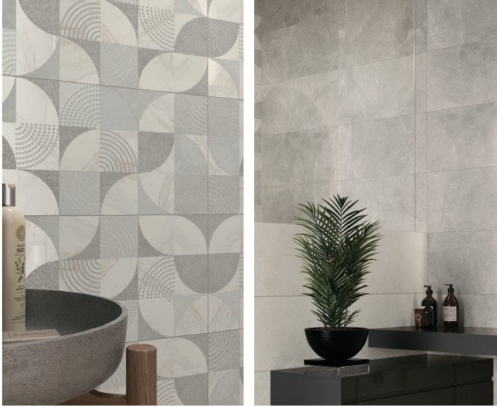 отличается нежной цветовой гаммой оттенка grey, напоминающей классический камень. Объедините базовую плитку с универсальной стеклянной вставкой с