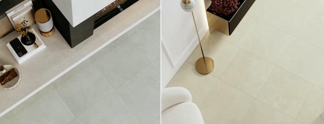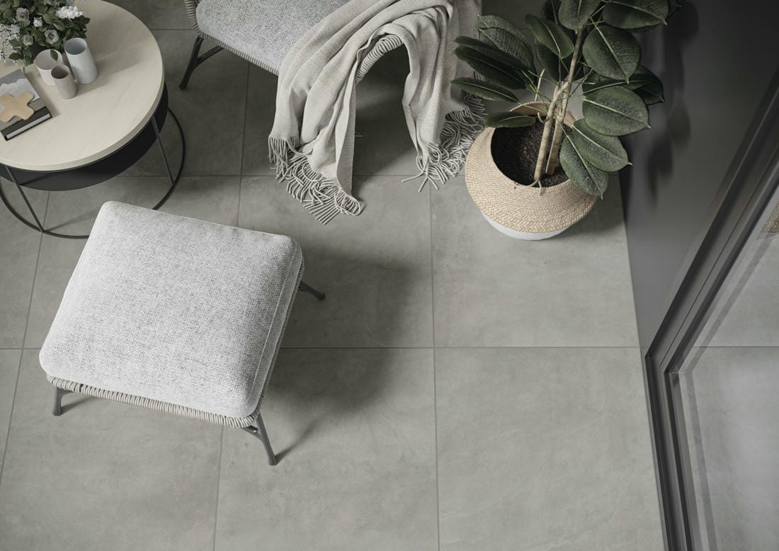 Evolution от Laparet – бежевый и серый керамогранит под бетон усилит зелёный цвет растений и сделает его более ярким, живым.