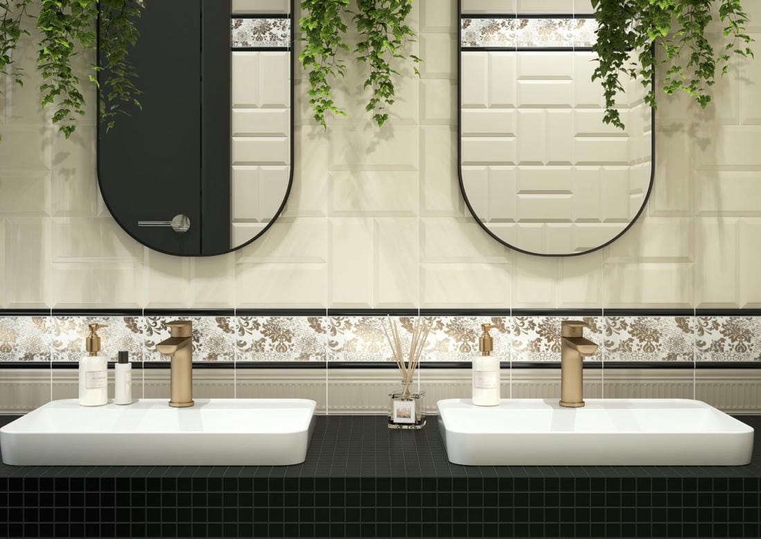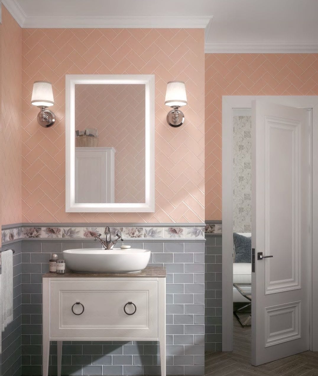 Плитка кабанчик с орнаментом, узором или надписями часто встречается в классическом, скандинавском стиле или прованс. Коллекция "Клемансо" имеет светлую и яркую базу моноколор и орнамент. Тут возможны варианты: можно сделать яркую акцентную стену с орнаментом, или сочетать светлый тон с декором и получится спокойная декорация стены.