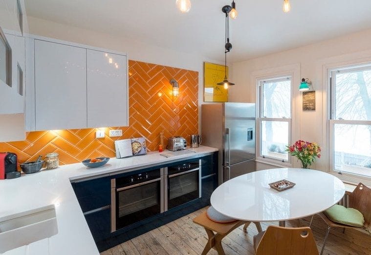 Если кухне не хватает света и уюта, а в ванной хочется ощущать жизнерадостное настроение, то замечательным решением станет использование оранжевого или желтого оттенка плитки. Цветной кабанчик придаст пространству особый яркий характер.