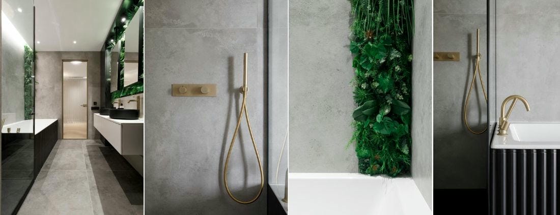 Для отделки пола и стен здесь выбрана крупноформатная плитка Millenium 80х160 см в серебристо-сером оттенке Сильвер и натуральном типе поверхности. Строгость материала подчеркивается ровными геометричными линиями мебели и зеркал, при этом за счет обилия зелени и правильно подобранного освещения помещение не выглядит скучным или ординарным. Санузел получился минималистичным, но при этом запоминающимся и ярким.
