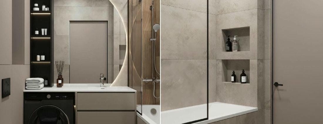 В оформлении этой небольшой, но при этом очень функциональной ванной дизайнеры использовали сразу несколько отделочных материалов от Italon, которые прекрасно сочетаются друг с другом. Большая часть стен в санузле облицована светло-серым керамогранитом под бетон Сильвер из коллекции Millenium в крупном формате 60х120 см. Это позволило сделать очень компактное по площади помещение визуально больше и просторнее. А для отделки пола и выделения акцентной угловой зоны в душевой была выбрана плитка с графикой дерева из серии Maison в оттенке Бренди и размере 20х120 см. Такое решение помогло добавить холодному и минималистичному интерьеру теплоты и уюта.