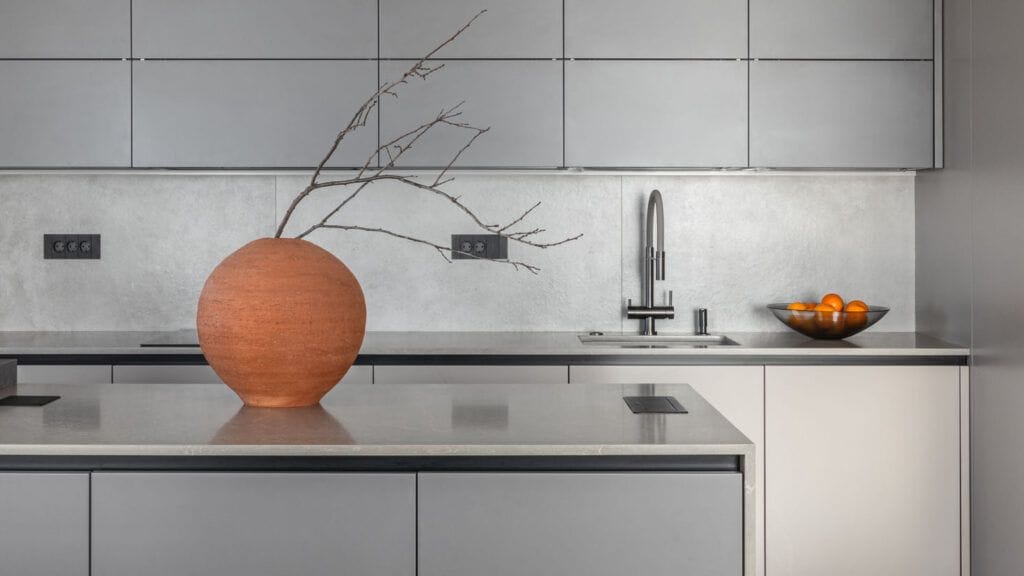 Еще один способ использовать керамогранит с бетонной текстурой – облицевать им зону фартука и стены в открытой кухне-гостиной. Такое решение смотрится необычно и свежо, а интерьер получается лаконичным и изящным. Плиты буквально сливаются с фасадами, за счет чего помещение приобретает целостный и гармоничный вид, а также становится визуально больше. Для проекта была выбрана плитка из коллекции Millenium в цвете Сильвер и формате 60х120 см. Она смотрится очень лаконично и красиво, а еще за ней легко ухаживать, что особенно важно для кухонной зоны. А яркие оранжевые акценты добавили комнате цвета и динамики.