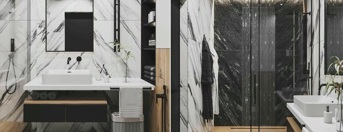 В проекте использована плитка с тремя типами графики – белый мрамор с контрастными черными прожилками Charme Deluxe в оттенке Статуарио Фантастико 80х160 см, темный графитовый Skyfall Неро Смеральдо 80х160 см с нежными светлыми вкраплениями и, наконец, теплый дуб Loft Хани 20х160 см с реалистичным рисунком древесины.