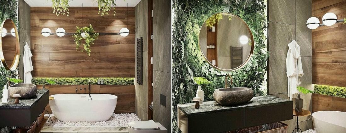 Темный керамогранит с текстурой итальянского орешника Maison Волнат 20х120 см на одной стене, брутальная плитка под необработанный камень Metropolis Графит Дарк 60х120 см на других, пышная зелень на потолке и в зоне у зеркала, оригинальное оформление ванны с помощью крупного белоснежного гравия.