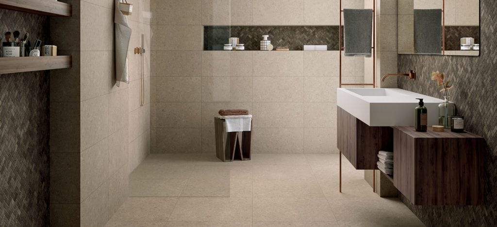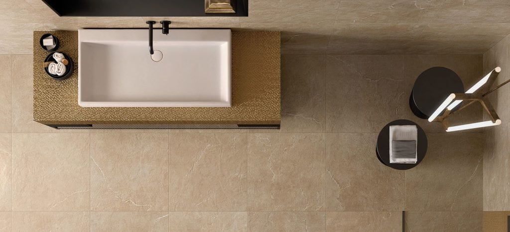 Подобный цвет окажется подходящим вариантом для оформления ванной комнаты. Так, бежевый керамогранит под камень позволит создать в помещении любого размера эффектную композицию в современном стиле. Он сделает интерьер более роскошным и изысканным.