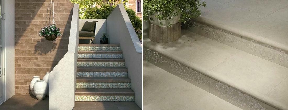 Горизонтальная часть ступени, называемая проступью, принимает на себя основную нагрузку. Расположенная ниже вертикальная часть – подступёнок – в основном выполняет декоративную функцию. В качестве подступёнков при использовании внутри помещения можно рекомендовать декоративные элементы соответствующей высоты: особенно часто в ход для этого идут декоры высотой 9,8 см и 15 см. Майоличные глазурованные декоры придают лестнице удивительный колорит – тёплый, рукотворный.