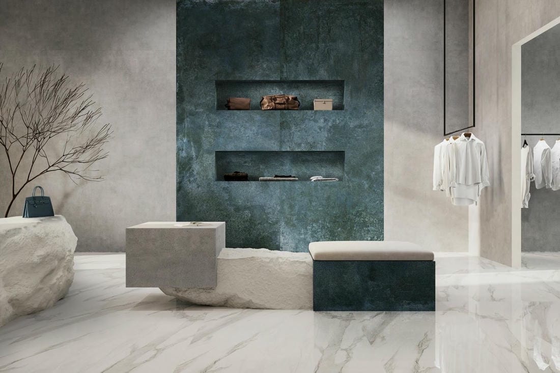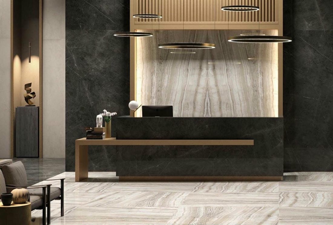 В интерьере тонкую плитку часто используют для выделения акцента на стенах. К примеру: на ресепшене в отелях, офисных пространствах, салонах красоты, в зонах стойки для администраторов.